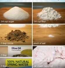 esta es una receta que requiere tan poco esfuerzo para que sea divertido no. Esta receta sirve a una personaINGREDIENTES:1/4 taza de harinablanco 1/4 taza de azúcar2 cucharadas de cacao2 cucharadas de aceite o mantequilla derretida pero aceite de coc