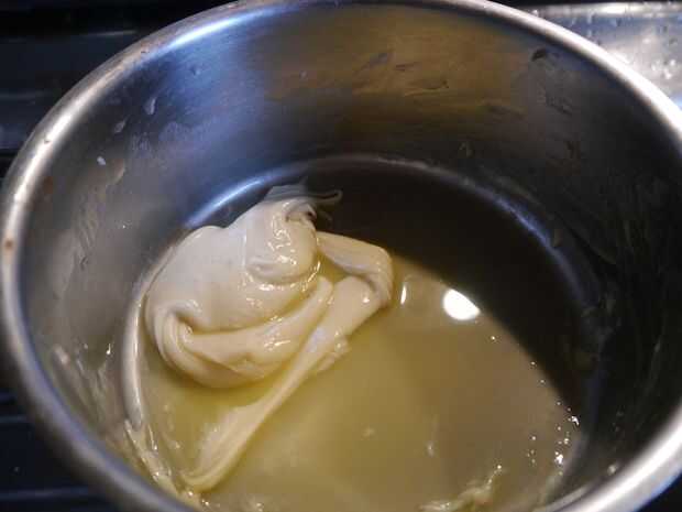 Para mostrar recalentado chocolate blanco que es más sensible al calor (cuarta foto). It´s extrema porque quemé casi pero esto es exactamente lo que usted shouldn´t. El chocolate y el azúcar con abrazadera juntos y separaron de la grasa.