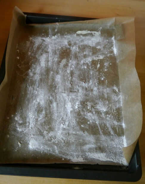 Cuando you´ve haya terminado esta tarea debe comenzar su horno para precalentar (a 180° C, 356° F). Preparar la bandeja del horno cubriéndola en pergamino de la hornada y mantequilla luego espolvorear harina sobre él (tercera imagen).