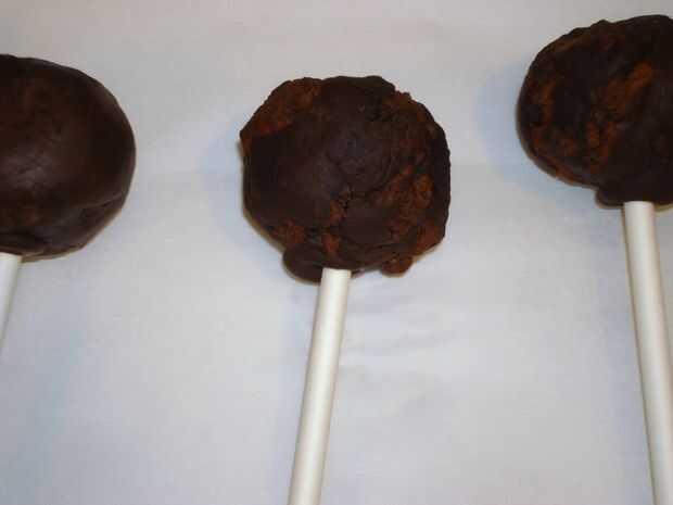 Sumergir la punta del palo en el chocolate derretido y colocar el palillo en el centro de la bola y tipo de apriete la masa para que se pega al palo.