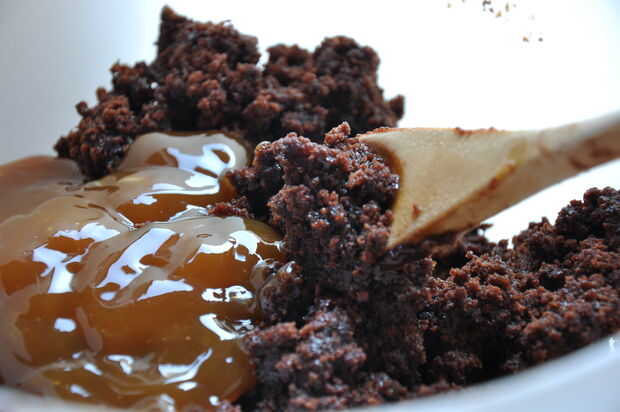 Cuando está todo roto, vierta el caramelo y revuelva apenas. Va a hacer muy gruesa y muy, muy pegajoso. De mis muchos intentos fallidos, he determinado que es la mejor manera de proceder de aquí a su tazón de fuente de la bondad de brownie en el congelador durante unos 20 minutos. Debe sacar disco, y quieres hacerlo. Ablandará muy fácilmente y rápidamente una vez que usted toma hacia fuera y cuando es suave, es muy difícil trabajar con.