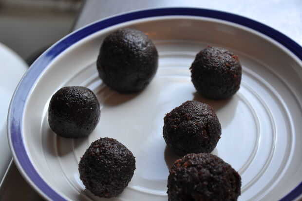 Una vez ha sentado en el congelador por un tiempo, llevarlo hacia fuera y prepárate hacer unas bolas de brownie. Tomar sus placas (usted puede poner algo como papel encerado en las placas para tratar de evitar que se pegue a las placas, pero podrían pegar en el papel de todos modos) y unos 5 o 6 para cada placa. Si es necesario, que lo hizo, uso un tenedor para obtener globos de la mezcla. Hacerlos no mayor que aproximadamente una pulgada de diámetro; cuanto más grande son los más pesados se obtienen cuando están tratando de cubrir en caramelo. Ponerlos en el congelador una vez más.
