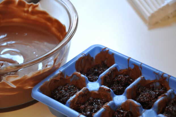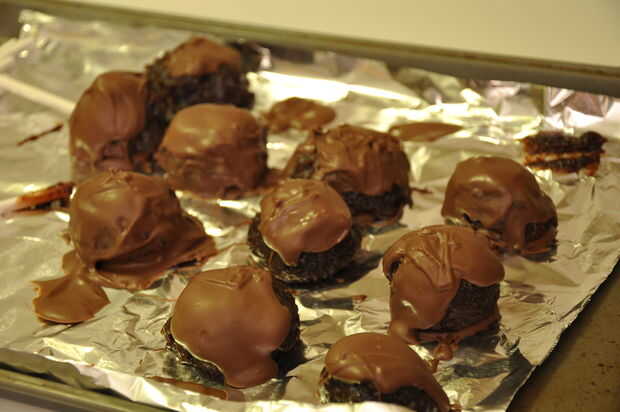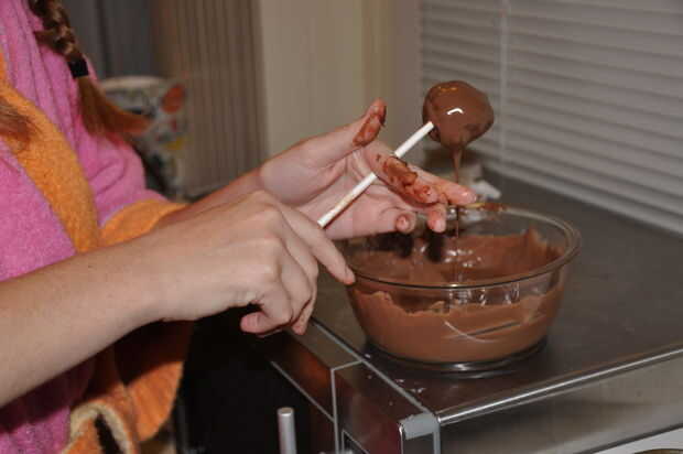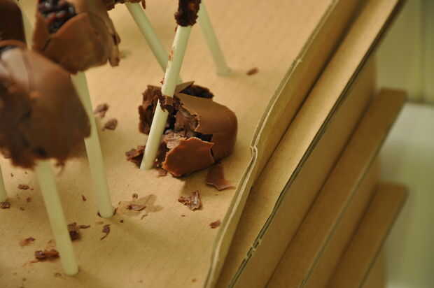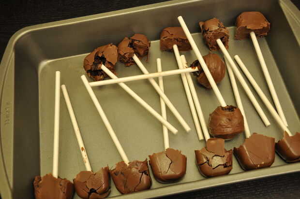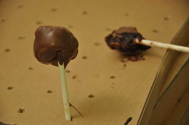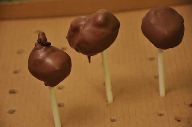 El segundo set de fotos es de ayer cuando intenté utilizar una bandeja de cubos de hielo. Mi marido tenía un poco de éxito cuando llena el agujero de bandeja de cubo de hielo hasta la mitad con candy melt, tomó un pequeño trozo de goo de brownie, ponerlo en el derretimiento de caramelo y empuja hacia abajo un poco para que el caramelo de la capa fue arriba a los lados, cubierto con más caramelo derretir y puesto en un palo. Todavía es un poco difícil salir de la bandeja aunque. Tuvimos que romper hacia fuera como usted romper hielo en un intento por eso están desmoronando. Intenté utilizar el spray en la bandeja del cubo de hielo, pero cuando le pongo el candy melt en eso, consiguió toda mocosa y no parecen funcionar bien y estaba cubierta con spray de mantequilla.