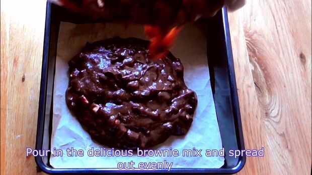 • Vierta en la mezcla de Brownie de Chocolate alisando hacia fuera uniformemente y cocer en el horno durante unos 25-30 minutos hasta que esté cocido. Para ver si los brownies estén cocidos, palillo, un cuchillo en el centro y si sale limpian con algunas migas, se hace el brownie