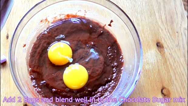 • Añadir los huevos 2 a la vez a la mezcla de Chocolate derretida asegurándose de mezclar bien.