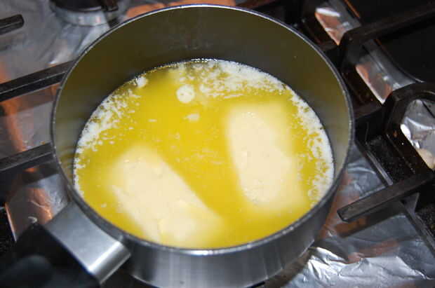 En una olla en la estufa, poner 1 taza de mantequilla a fuego muy lento hasta que poco a poco derrite, pero no quemarse.