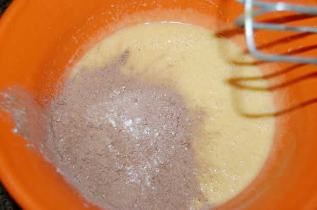 Empezar a verter en el seco ingredientes para ingredientes húmedos y mezclar muy bien hasta que todo está bien disperso.