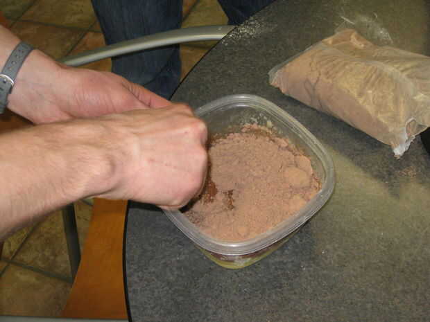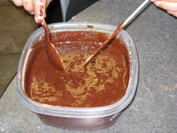 2. mezclar hasta que la mezcla alcance la consistencia fangosa. Si después de un minuto de la mezcla la mezcla sigue siendo muy sólida, agregar una pequeña cantidad de agua y mezclar hasta que la masa pueda gotear lentamente de la cuchara.
