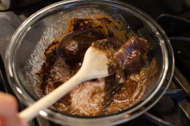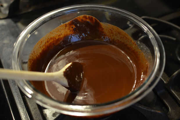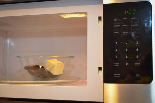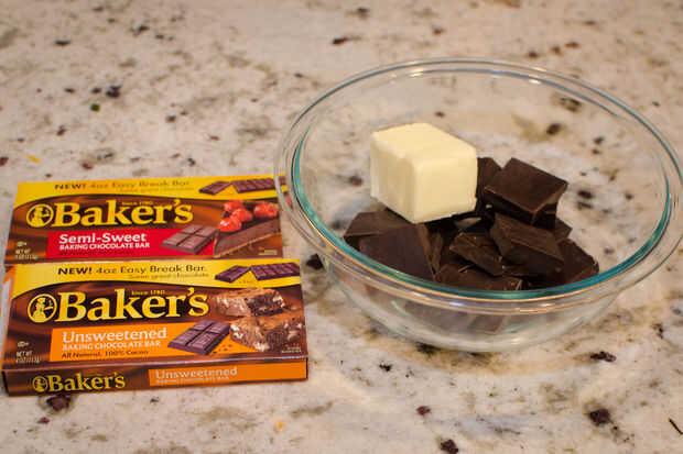 Microondas los 3 primeros ingredientes (4 oz sin azúcar chocolate, 4 oz de chocolate semidulce y 1/3 taza de mantequilla) en un tazón 1 cuarto microondas 2 minutos o hasta que se derritan, revolviendo cada 30 segundos o menos. Enfriar.