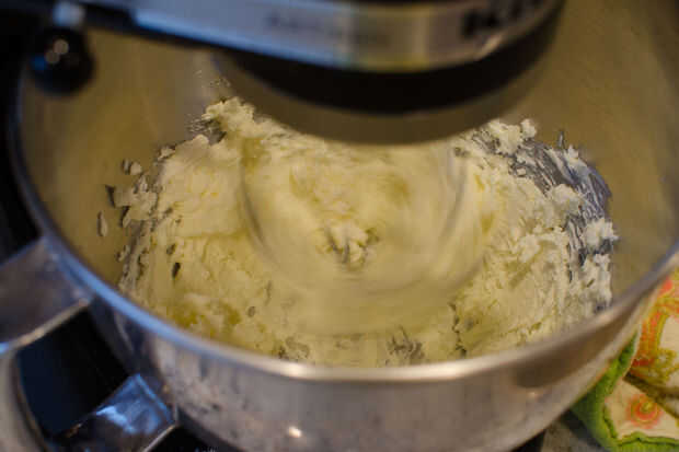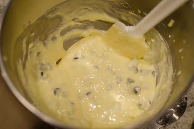 Batir el queso crema y 1/4 taza de mantequilla a velocidad media con una batidora eléctrica hasta que esté cremosa. Poco a poco agregue 1/2 taza de azúcar y batir bien. Añadir 2 huevos, uno a uno y mezclar hasta que quede mezclado. Agregue 1 cucharadita de vainilla, luego incorpore 2 cucharadas de harina y 1/2 taza chocolate bocados. Ponga a un lado.