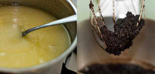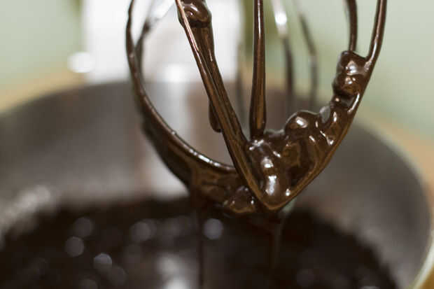 3. Vierta la mezcla de mantequilla en un tazón grande o batidora, batir en cacao en polvo, huevos, sal, polvo de hornear, polvo de café y extracto de vainilla. Mezclar hasta combinar bien.
