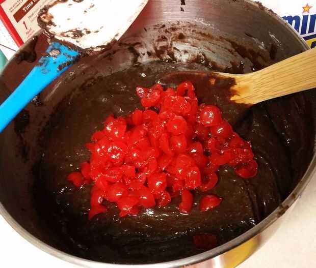 ingredientes:100g sin sal mantequilla200g de chocolate oscuro/llano250g de azúcar4 huevos100g de harina30g bebida de chocolate1 cucharadita de polvo de hornearmitades de cereza 100gEquipo:Tazón grandeBowl ambiente microondasBate (ya sea eléctrica o a