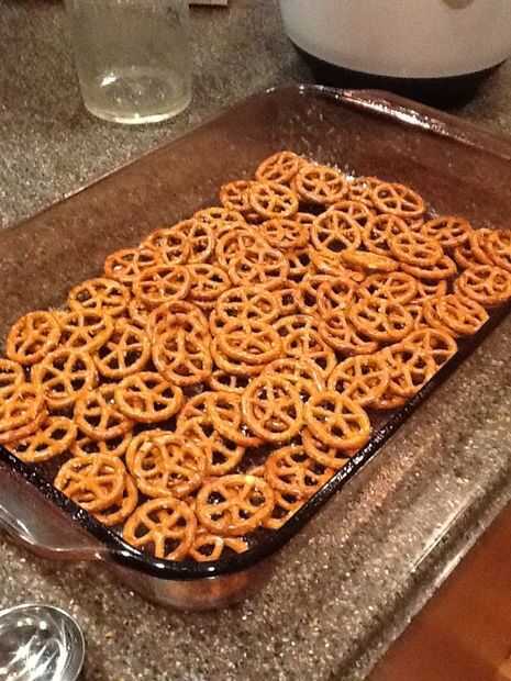 En una sartén de tamaño regular, poner abajo una capa o dos de pretzels como arriba después has rocía la sartén con Pam.