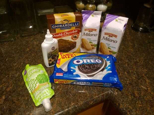 Estos suministros son bastante simples. Una caja de brownies (lo que marca y sabor que prefiera), galletas (de cualquier sabor que prefiera) de Milano, Oreos, negro y verde glaseado. Usted puede conseguir creativo con sus guarniciones, pero esto es lo que utilizamos. Puede añadir dulces calabazas, maíz de caramelo o esqueletos a sus creaciones.
