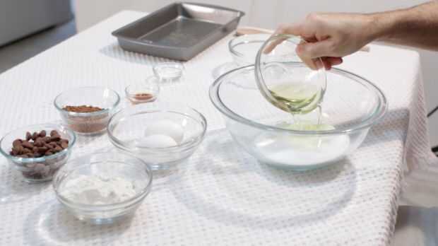 Primero vamos a precalentar el horno a 350 grados el f (177 C) a continuación mezclaremos el azúcar con nuestro aceite. Sólo estamos usando una cuchara de madera, para mezclar, no va a utilizar una batidora eléctrica, es muy fácil sobre la masa de la mezcla.