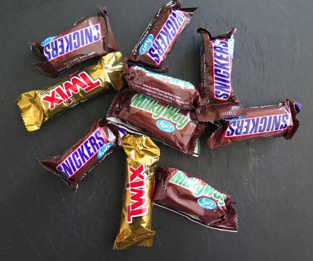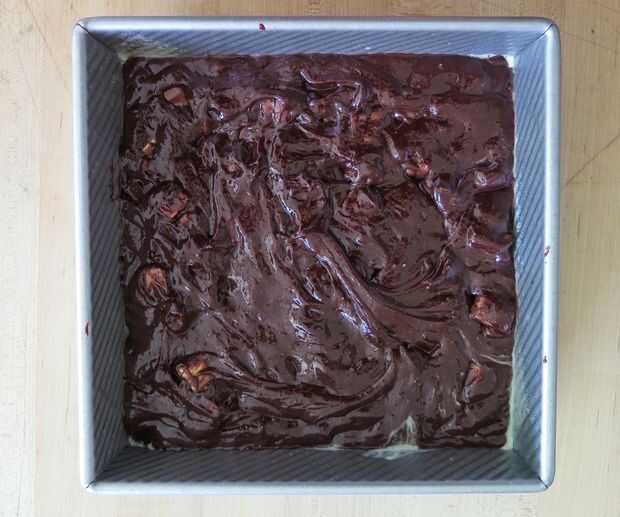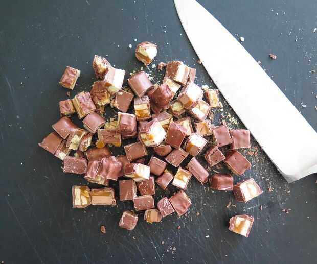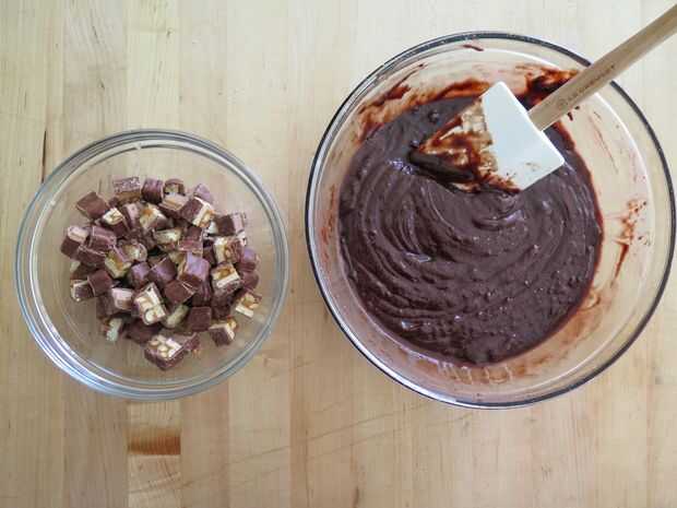 Una vez que los brownies se mezclan, usted puede lanzar en sus barras de caramelo. Opté por corta mina en trozos primero, pero no tienes que. Sugiero que hagas aunque.
