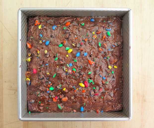 Tiempo al comienzo de tus brownies! Me puse todo mientras estaba todavía caliente en la sartén. Esto causó el M & M conseguir suave en la parte superior y me ha gustado de esa manera. El caramelo también tipo de ayuda a sostener en los M & M por lo pongo en primer lugar.