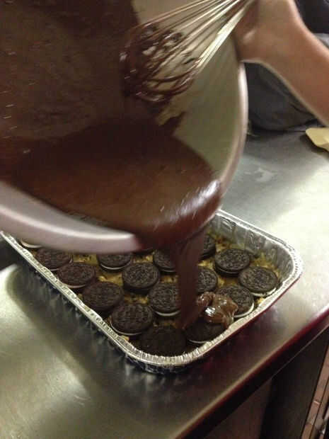 Verter la mezcla de brownie sobre la capa de Oreo. Estirar la masa para cubrir todas la galletas Oreo. Sacuda suavemente la sartén de lado a lado sobre el mostrador para equilibrar la mezcla.