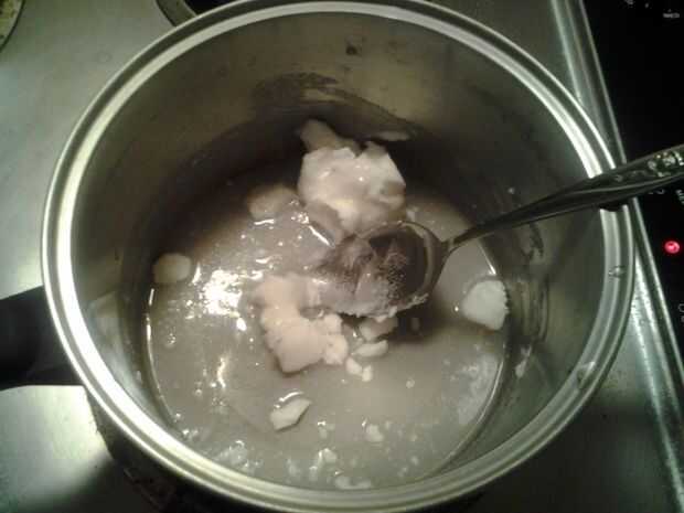 Una vez que la mantequilla se haya derretido, agregar la manteca y el agua (por esta razón no desea que la mantequilla hirviendo). Mezclar bien.