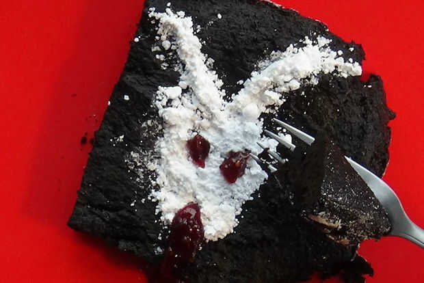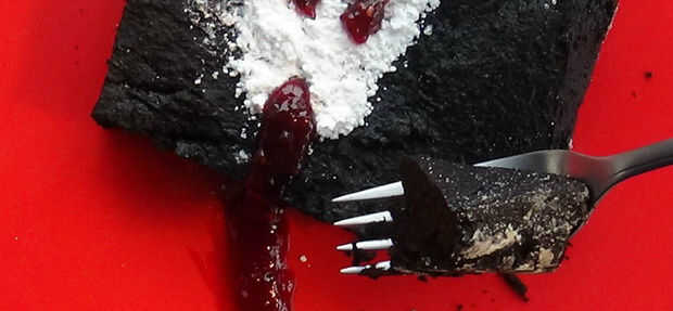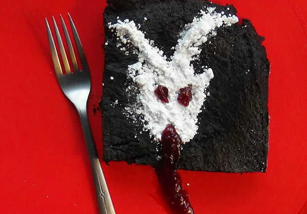 Mi amigo me hizo una rápida plantilla de cabeza de Krampus y luego añade los ojos y lengua larga con jalea de fresa. El sabor mezclado extrañamente bien con el brownie dark picante. Si quieres una plantilla similar recomiendo solo dibujo una cabeza alargada con orejas puntiagudas y cuernos largos. No sé si mina se ve como el Krampus o como un conejo...