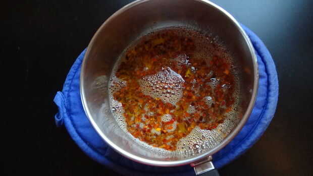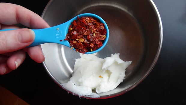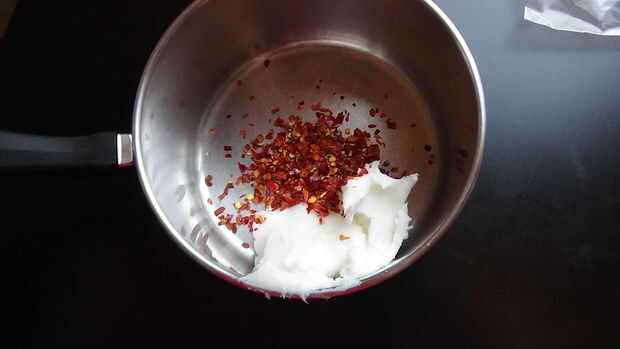 Una vez en la olla pequeña agregar 1 cucharada de hojuelas de Chile y poner en fuego medio hasta que la manteca se haya derretido. Luego tomar la olla del fuego y ajustar un temporizador de 10 minutos. Puede dejar la manteca por un buen rato y todavía será líquidos pero tienes que esperar al menos 10 minutos para la manteca de cerdo picante ser lo suficientemente frío como para no revolver los huevos. Confía en mí que no quieres huevos revueltos en masa grasa parcial brownie, es desagradable.
