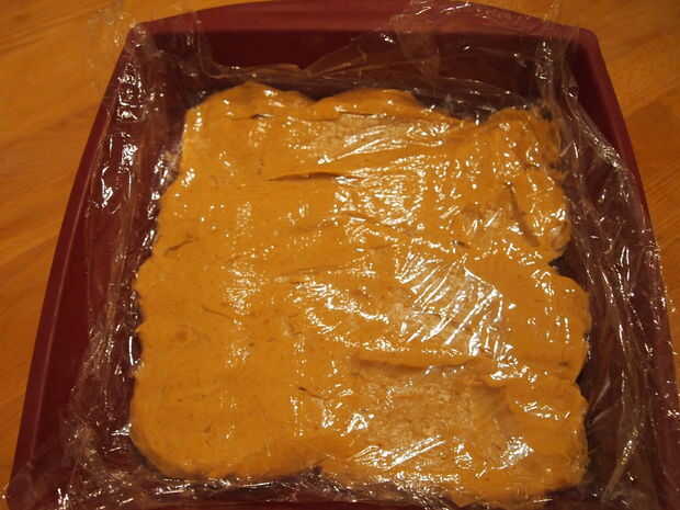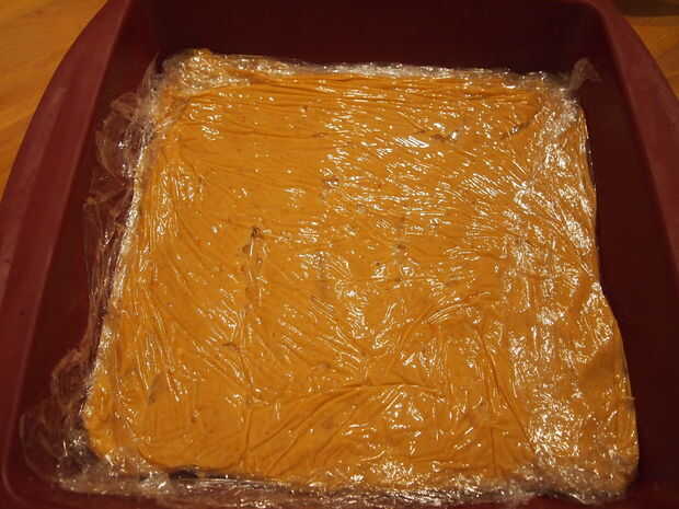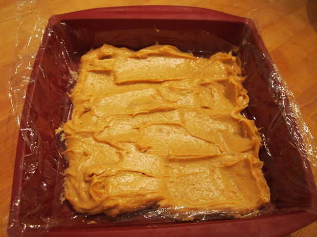 Esta línea con envoltura de plástico, añada la mezcla de queso crema de mantequilla de maní y aplanar, agregar una capa de envoltura de plástico en la parte superior y aplanar.