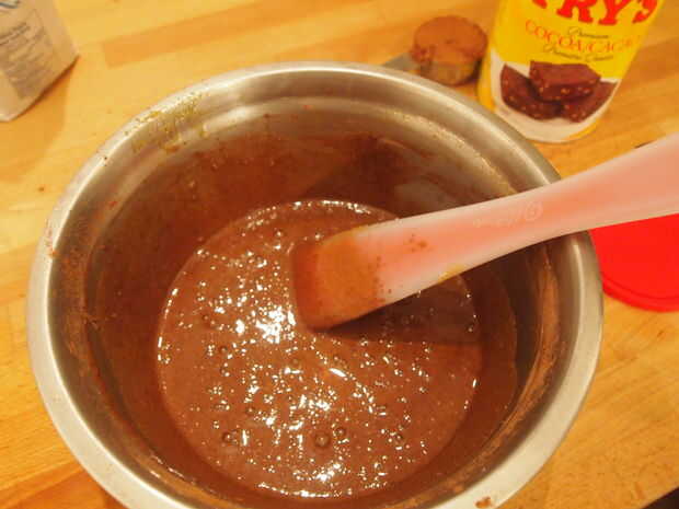 Al llegar al final te darás cuenta de cacao pegados a los lados, generalmente sólo extienda la mezcla en los lados del tazón de fuente y luego volver a limpiarlo a mezclarlo todo antes de añadir el siguiente 1/4 de taza.