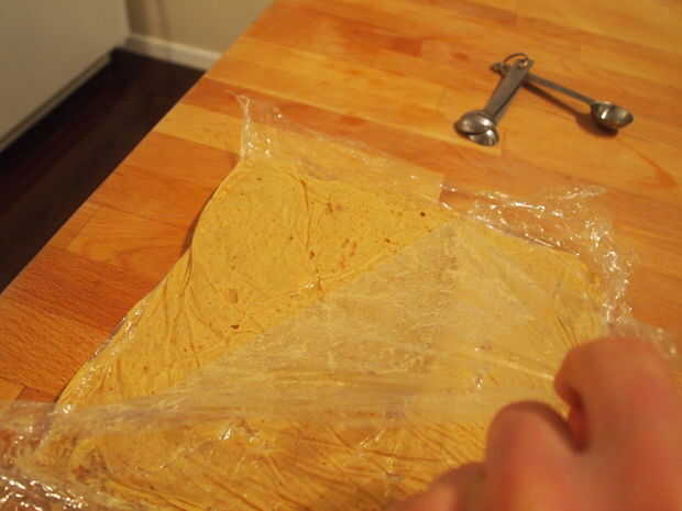 Extender el resto de la masa en la parte superior de la mantequilla de maní y crema de queso.