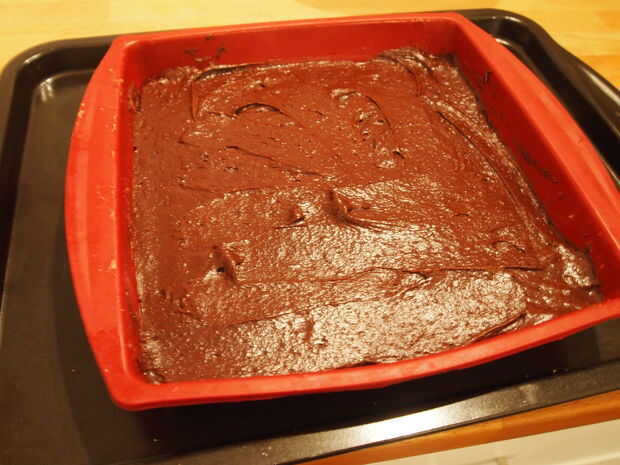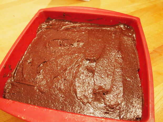 Vierta la mitad de la masa en la bandeja para hornear y suavizar.