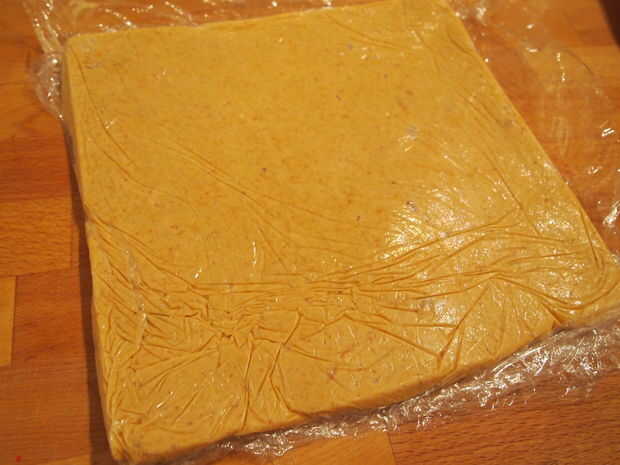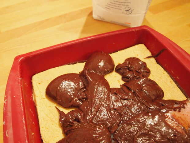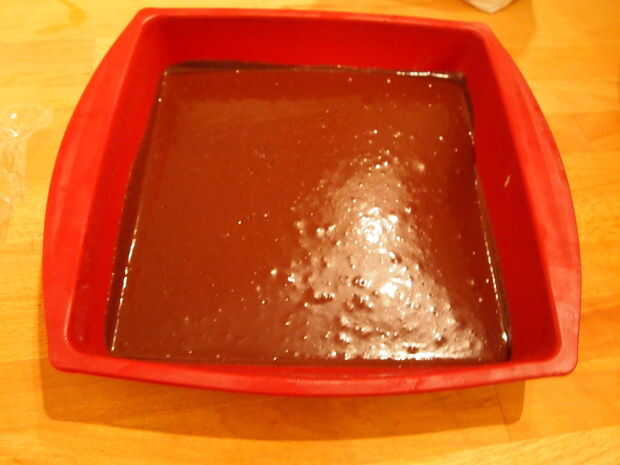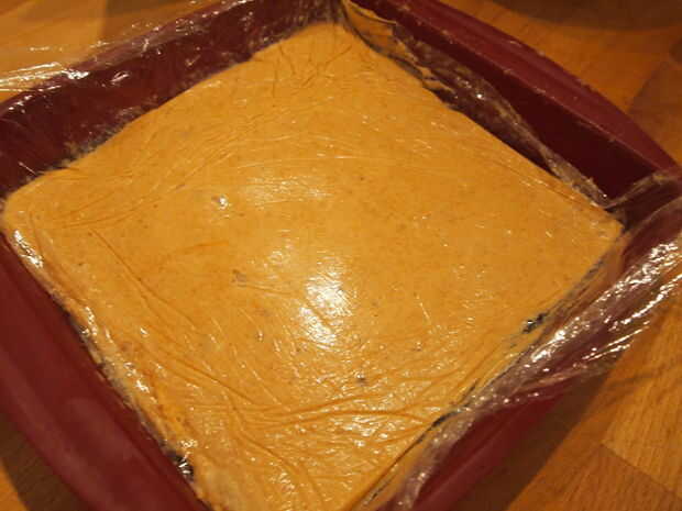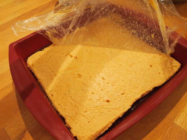 Se voltea la mezcla sobre la masa de brownie, pelar el otro lado de la envoltura plástica de la mantequilla de maní y crema de queso.