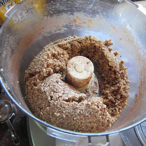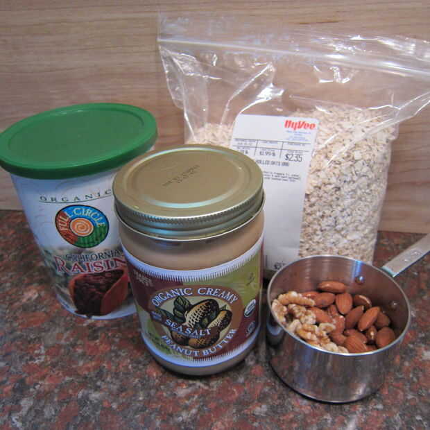 Moler las nueces, pasas y avena en el procesador de alimentos hasta desmenuzable. Agregue mantequilla de maní y genio hasta que mezcla juntos y puede mantener su forma. Ponga a un lado.