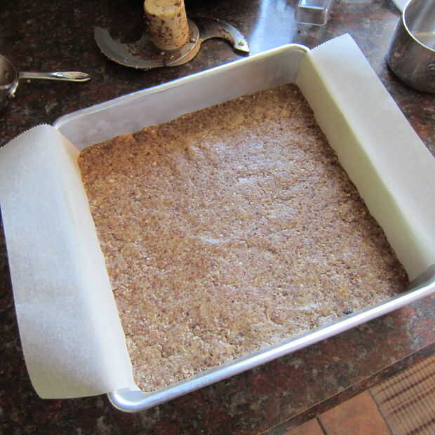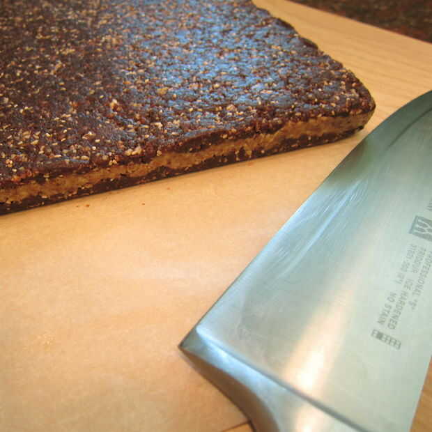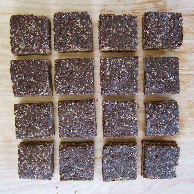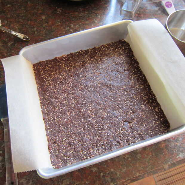 Levante con cuidado el pergamino fuera de la cubeta sobre una tabla de cortar. Usando un cuchillo afilado cortar brownies en 16 cuadrados iguales.