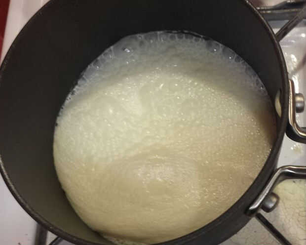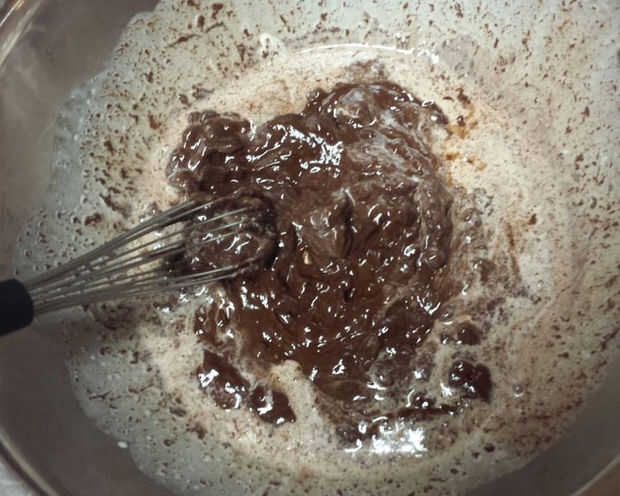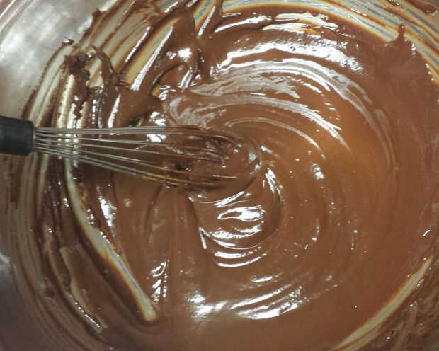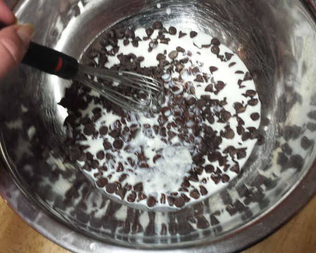 Tomar el resto de la crema de leche y poner en una cacerola pequeña a fuego bajo-medio y esperar a que hierva. Mantenga un ojo en ella porque no quiere que queme o rebalse. Tan pronto como la crema arranque el hervor, agregar el paquete de chips de chocolate en un tazón de fuente de calor segura y batir hasta que todos los chips de chocolate disuelto y la mezcla es lisa. Parece medio raro al principio, pero que está bien, sólo seguir batiendo!