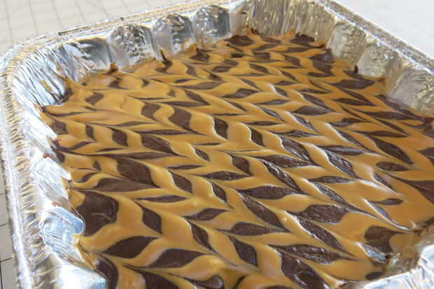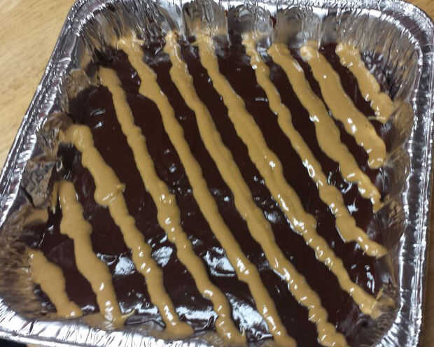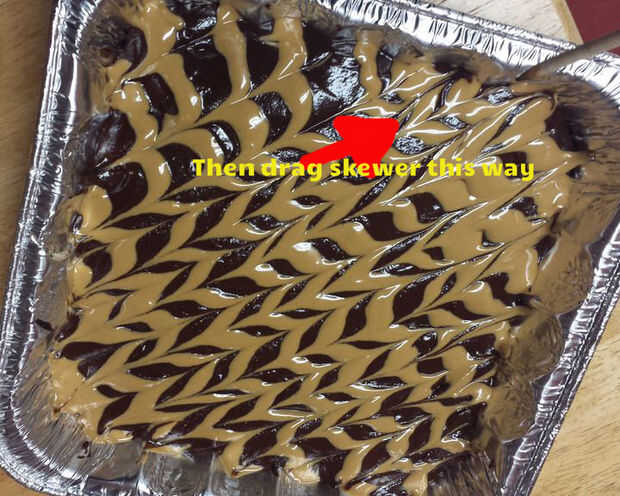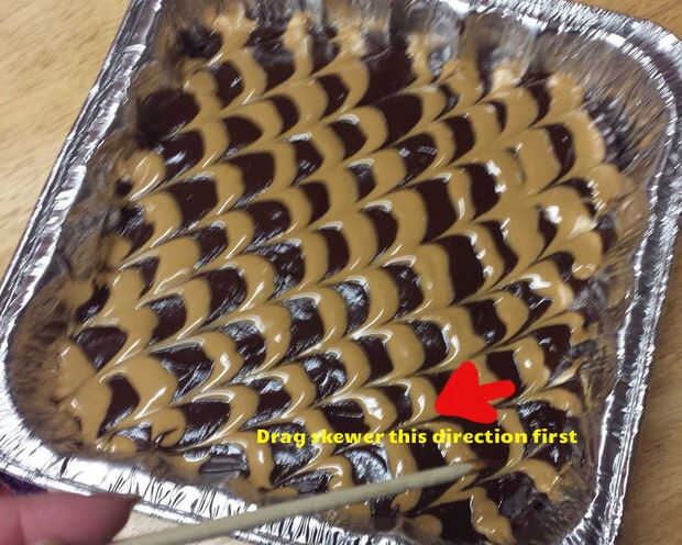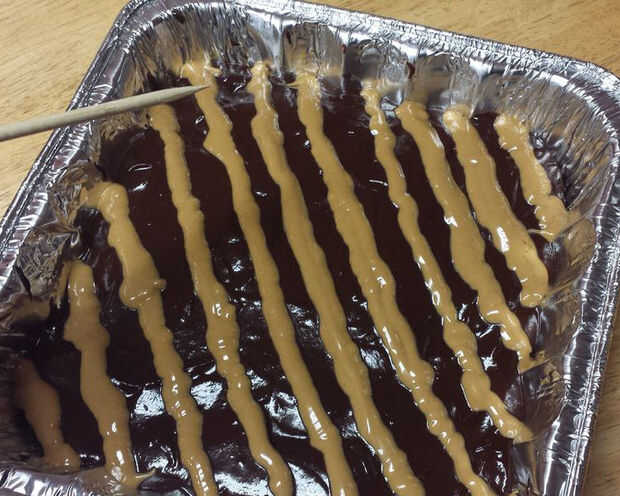 Una vez que el ganache es todo liso, vierta sobre tus brownies refrescados y liso en una capa uniforme. El bonito patrón, tomar el resto de la mantequilla de maní y ponerlo en el microondas durante 20-30 segundos. Utilizar una manga pastelera o incluso sólo una taza de medir con un caño a líneas finas líquido de mantequilla de maní diagonalmente a través de la bandeja. Luego tomar un palillo o brocheta y arrastre a través de las líneas de mantequilla de maní en la diagonal opuesta. Luego hacerlo de nuevo en la otra dirección para obtener el patrón de chevron.