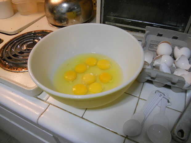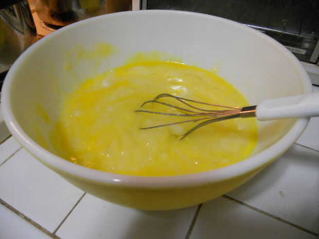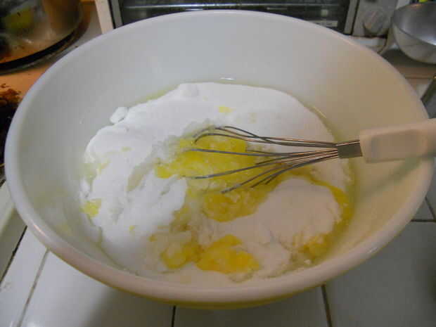 Mientras se derretía el chocolate, poner los huevos y azúcar en un tazón grande. Mezclar poco a poco, pero no mezcle! Lo suficiente como para machacar cosas.
