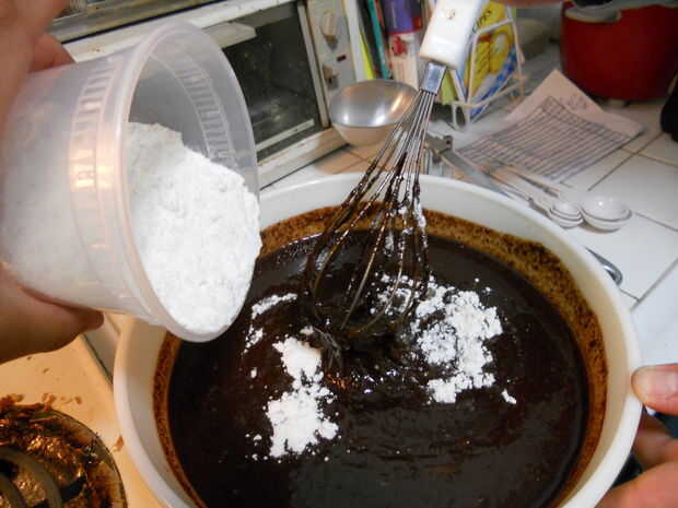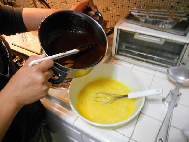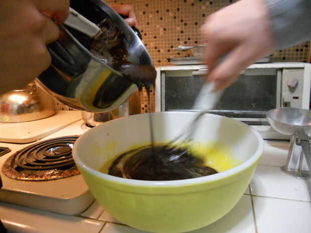 Luego, lentamente Vierta el chocolate derretido mezclado con extractos en el recipiente con los huevos y el azúcar. No demasiado rápido, o los huevos se pelean! Revolver slowwwwwly.