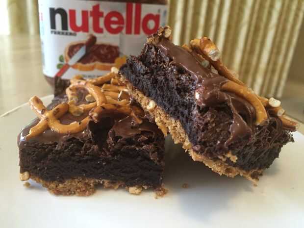 Hice estos brownies porque me encanta la Nutella, pretzels y brownies y éstos combinan a la perfección los tres! La salinidad de los pretzels realza el sabor del chocolate y la miga de pretzel en la parte inferior añade un crujido hermoso en contraste con el brownie de Nutella con. Me encanta el look de estos brownies debido a la base marrón dorada, el brownie de chocolate oscuro húmedo y la Nutella más ligero y pretzels picado se ve hermosa!