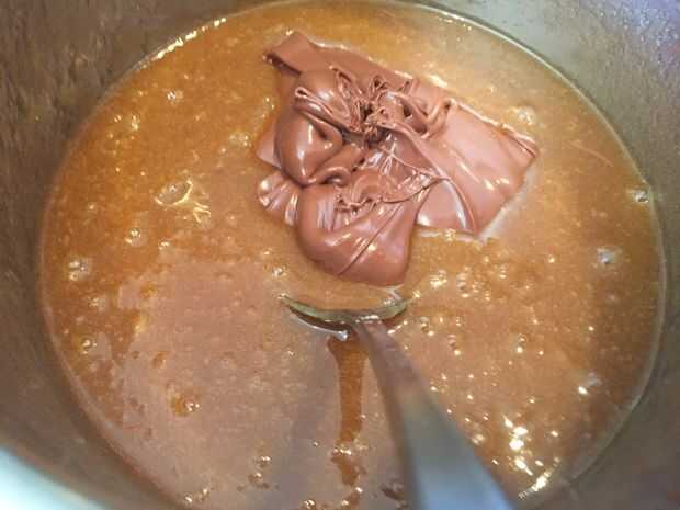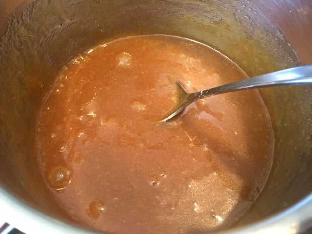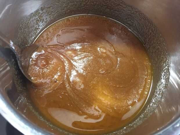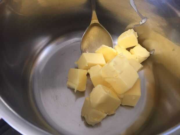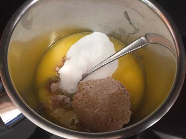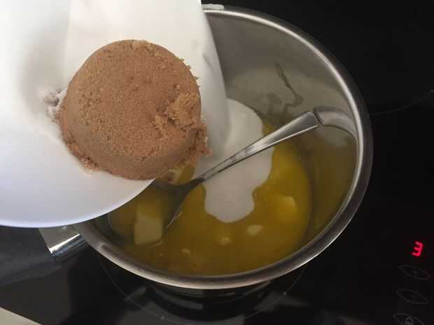 Mientras que la base de miga de pretzel es hornear hacer la mezcla de brownie colocando la mantequilla y el azúcar en la cacerola y derretir a fuego medio bajo, removiendo continuamente.