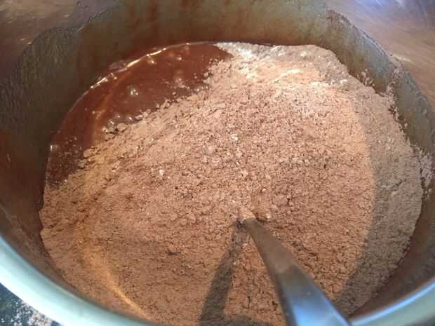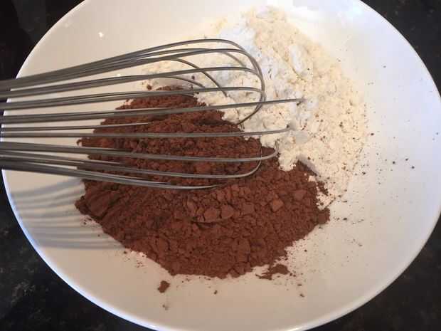 Luego tomar la mezcla de brownie del fuego y deje que se enfríe un poco. En un recipiente aparte mezclar la harina, polvo de cacao y sal junto (puede utilizar un batidor para eliminar grumos, ahorro de tiempo por no tamizar los ingredientes secos).