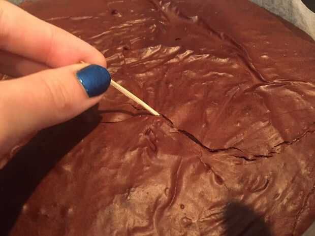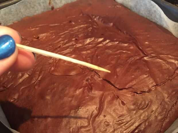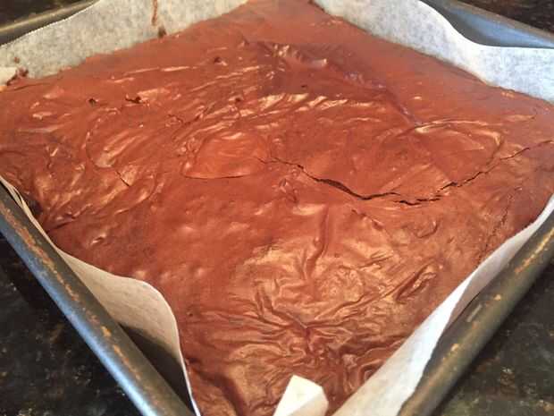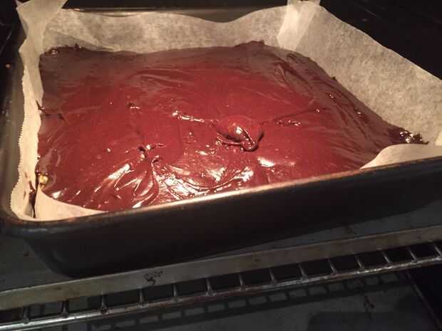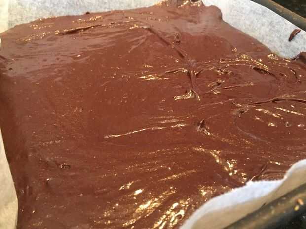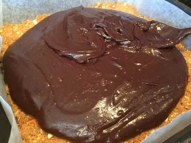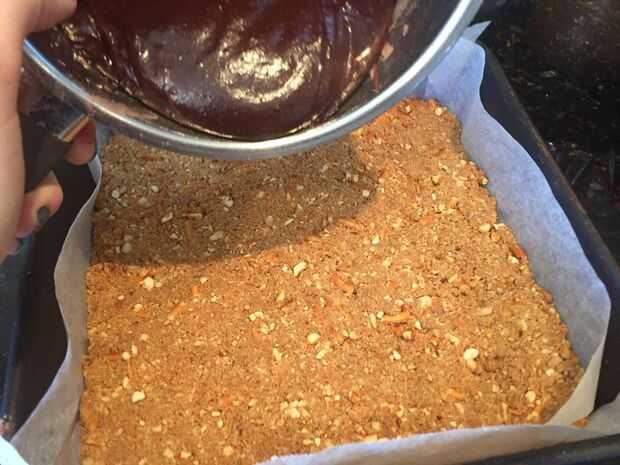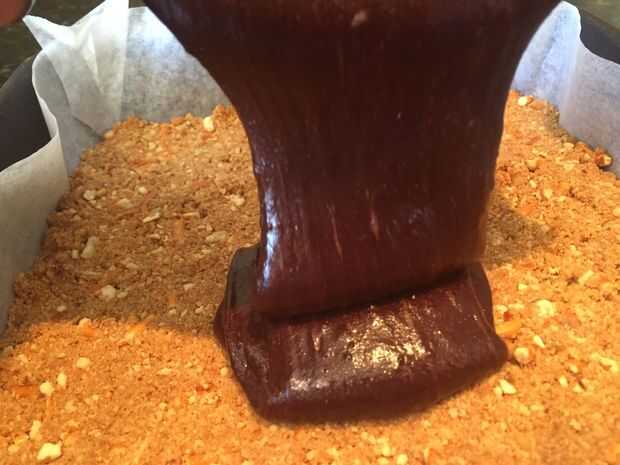 Una vez la mezcla de brownie sin grumos verter sobre la base de migas y uniformemente repartidas. Luego coloque en el horno y para 30-35 minutos a 180 grados centígrados, hasta que un palillo insertado salga el brownie limpio.