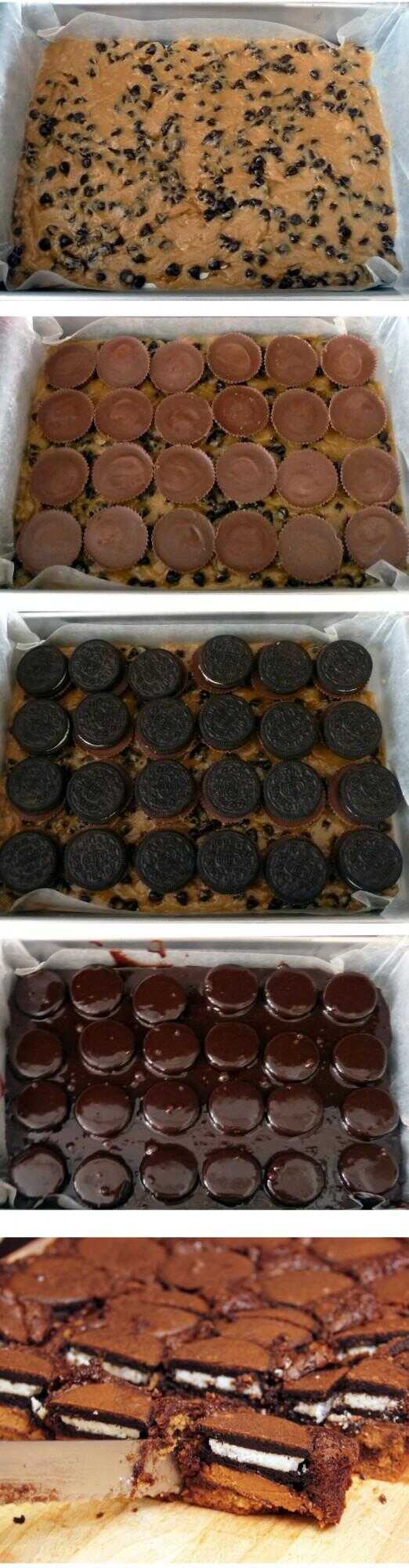 Hice en una bandeja de 9 "x 13" con pergamino o papel de cera, pasta de la galleta de capa, mantequilla de maní y galletas Oreo y tapa con masa de brownie. Los horneados a 350F por 40-50 minutos, hasta que un palillo entre Oreos salió limpio, pero los centros muy todavía pegajosa y crudos.