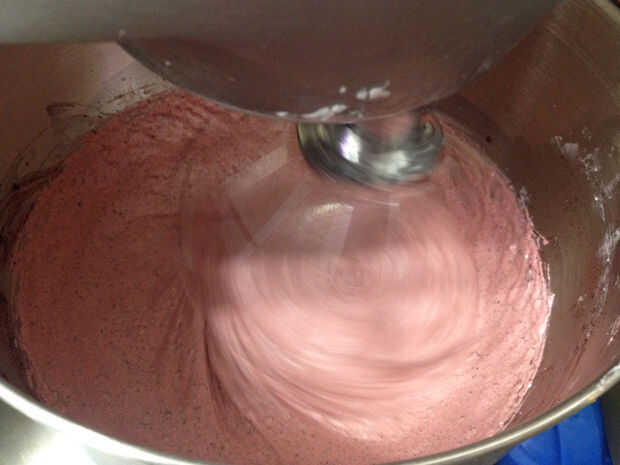 Mezclar el cacao en polvo, colorante de alimentos rojo, esencia de vainilla en un tazón de fuente