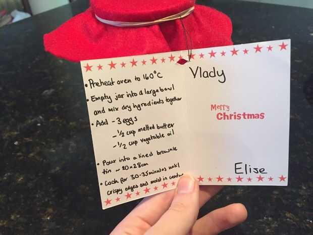Con la tarjeta adjunta Asegúrese de incluir la siguiente información. Precalentar el horno a 160 grados centígrados para un ventilador forzado horno. Grasa y una lata de brownie 20cmx28cm la línea. En un bol grande batir el contenido de la jarra y luego agregar 3 huevos batidos, 1/2 taza derretida mantequilla y 1/2 taza de aceite vegetal y mezclar hasta combinar bien. Luego cocer en el horno durante 35-45 minutos hasta que una brocheta de madera salga limpia.