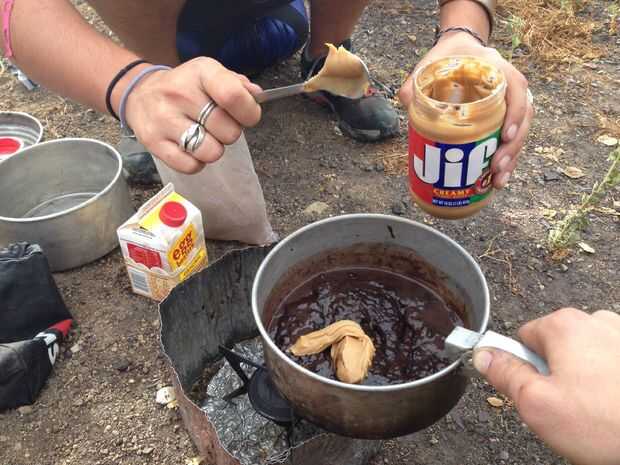 A continuación, agregue la mantequilla de maní. Mantequilla de cacahuete es posiblemente la mejor parte de Backwoods Gourmet Brownies y el ingrediente que lo distingue de brownies regulares. El PB toma el lugar del aceite en la receta de la caja de brownie y agrega que algunos tan necesitan proteína para la energía hacer frente a cualquier actividad de parte país tiene previsto. Ya que PB es tan deliciosamente útil, guardo un frasco en mi en todo momento en el país trasero y lo tengo en prácticamente todas las comidas. Uso tanto como usted siente es necesario en tus brownies. El sabor de pares PB bien con el chocolate brownies, así que siéntase libre de ser generosos. Te sugiero unas cucharadas saludables.