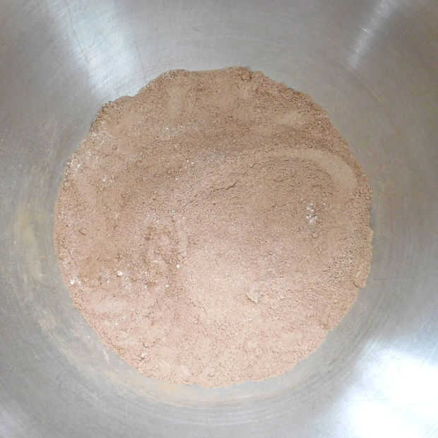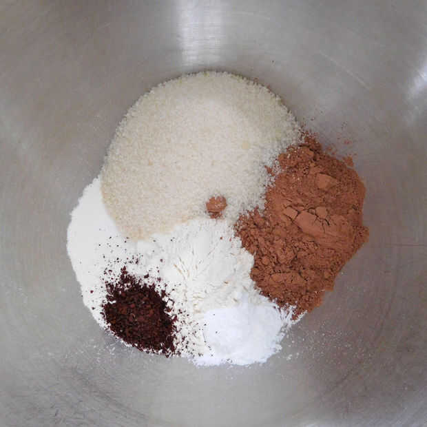 En el recipiente de una batidora con accesorio paleta combinar harina, cocoa, polvo de hornear, café, sal y azúcar.