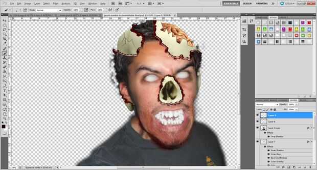 1. crear una nueva capa y con un cepillo no sólida, con puntos o raspones, color alrededor de la boca en rojo. El colorante no debe ser un movimiento continuo sino roto con puntos y rayas, algunas áreas deben ser más oscuras que otras. Bajar la opacidad de la capa para que puedas ver la cara de temas a través de la red. No aumente la opacidad detrás.