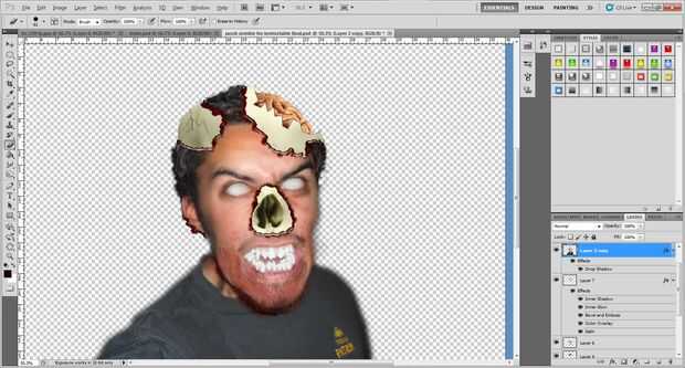 1. limpiar las áreas alrededor de la cabeza mediante una goma de borrar suave, cualquier acceso a sangre, pelo, pedazos de cráneo que no estaba cubierta por la cara. Esto hace parecer mucho más limpio en los bordes. Si estás satisfecho con la imagen, combinar la cara capas, sangre, cráneo, cerebro, etc..