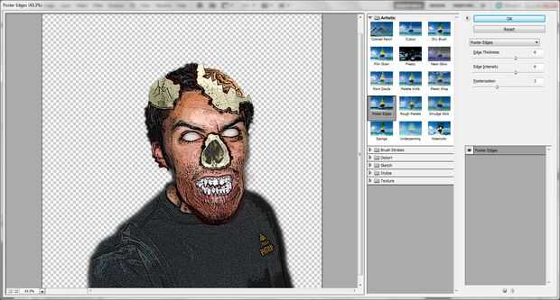 1. en la parte superior de photoshop haga clic en filtro -> artístico -> los bordes del cartel. Esto le dará un dibujo mucho más como apariencia. Si quieres poner más detalles pulse OK y de deshacer. Si desea cambiar una capa determinada, deshacer tantas veces como sea necesario para la fusión de las Naciones Unidas las capas.