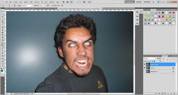 1. hay sólo un paso para esta transformación siguiente y para que necesitamos utilizar la herramienta. Seleccione la herramienta y asegúrese de que el tamaño del mismo es mayor que la de su pupila anterior, pero más pequeño que su iris. Utilice un cepillo suave, con la dureza en cero. Use el cepillo para ir alrededor de los ojos y cualquier arruga que tenga. Más pasar, más oscuro será el tono. Asegúrese de que no hacerlo más por lo que es totalmente negro. Desea oscurecer, no se ennegrecen hacia fuera. Utilizando la misma herramienta, hacer el cepillo más grande, del tamaño de tu ojo y circulan por la línea del cabello, la parte externa del cuello, y cualquier área oscura a la izquierda en la imagen.