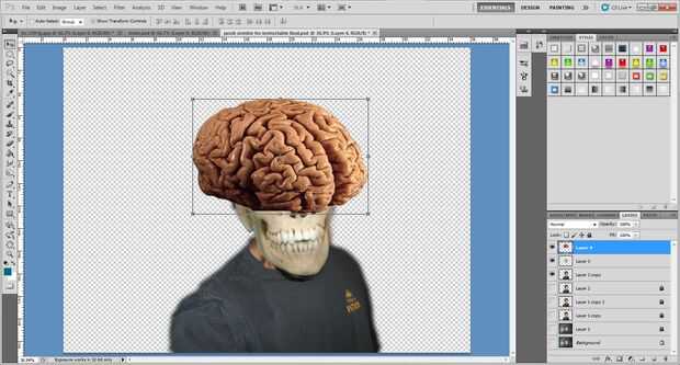 4 utilizando la herramienta de mover, cambiar el tamaño del cerebro para caber dentro del cráneo. Mantenga la tecla Mayús para mantener las proporciones del cerebro mismo.